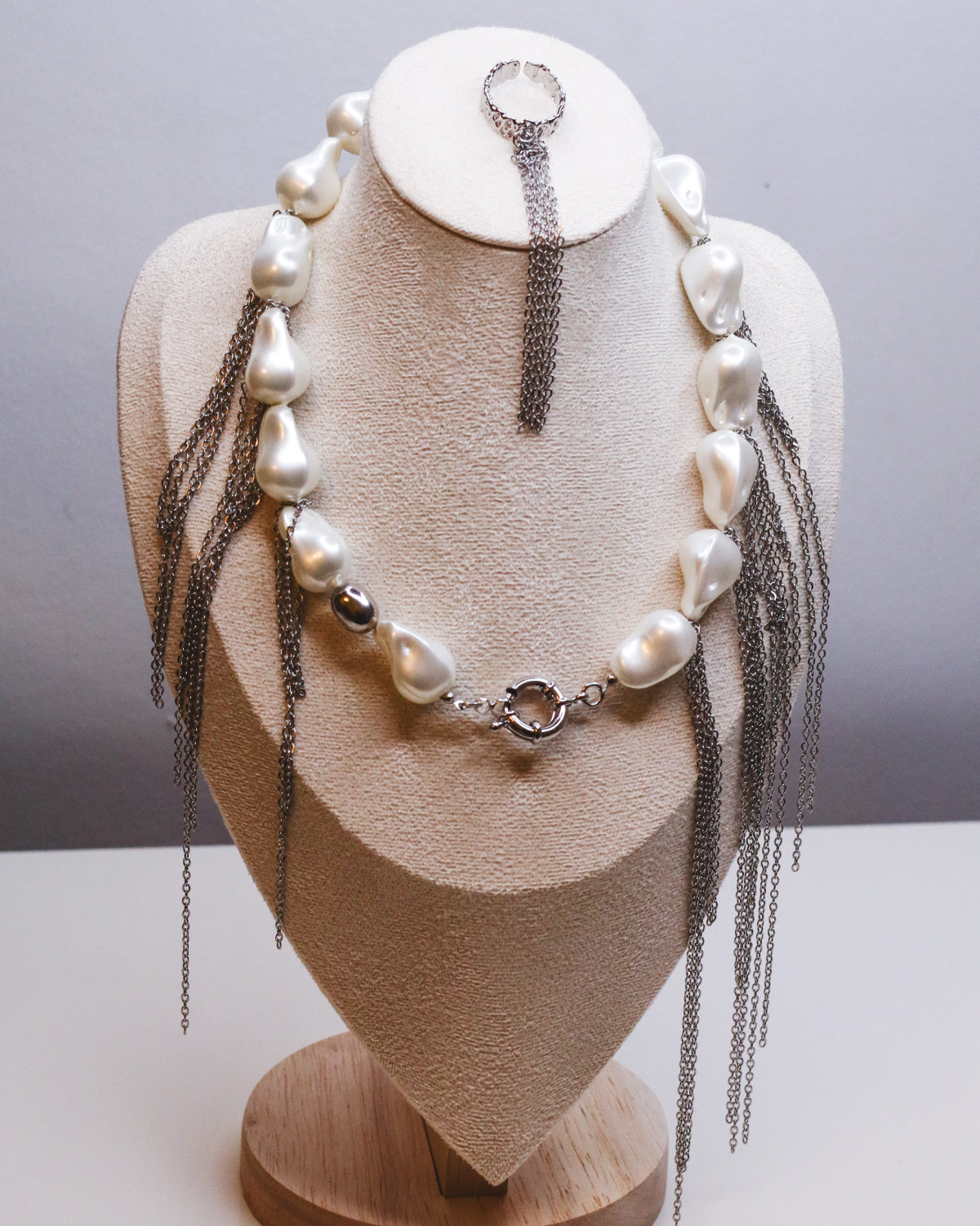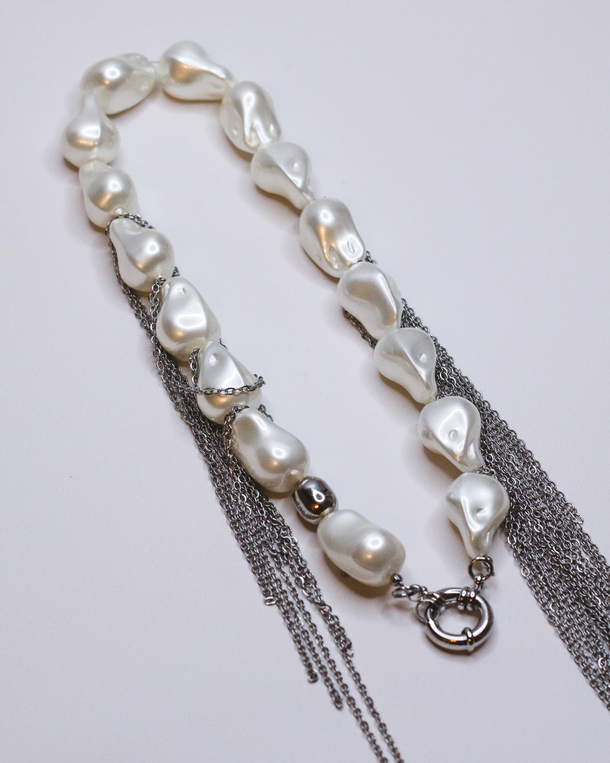 A strand of high-quality baroque-style pearls is paired with rhodium-plated chains that fall like silver tides. A single oval rhodium-plated bead anchors the piece, and a central clasp allows you to add charms, stones or tokens of your own.