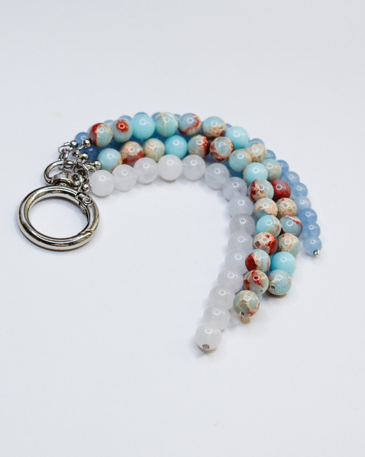 An elegant bag accessory featuring five strands of natural stones in soft, complementary tones – including Shoushan stone, and blue and white quartz. A subtle statement piece with a tactile, earthy charm.