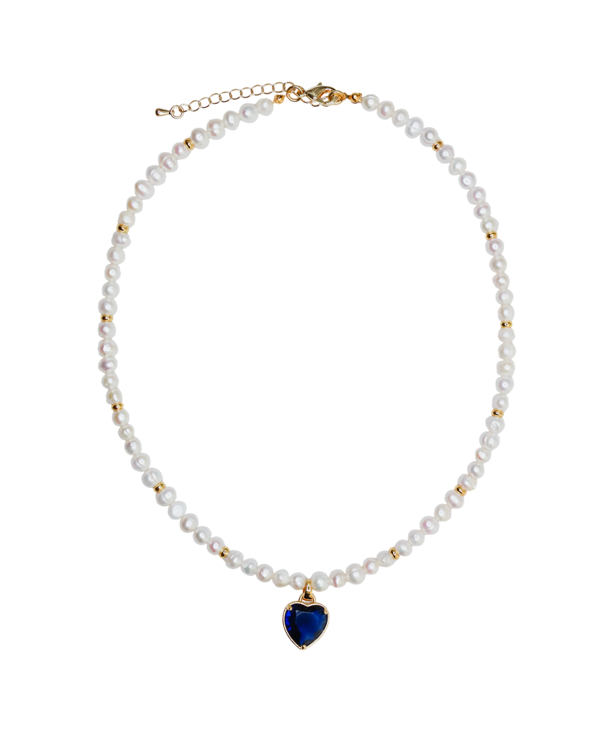 A delicate necklace made from river pearls with 18k gold-plated bead accents and a small deep-blue glass heart at the centre. Soft, luminous and quietly romantic — a piece shaped by ocean light and the gentle glamour of 1912.