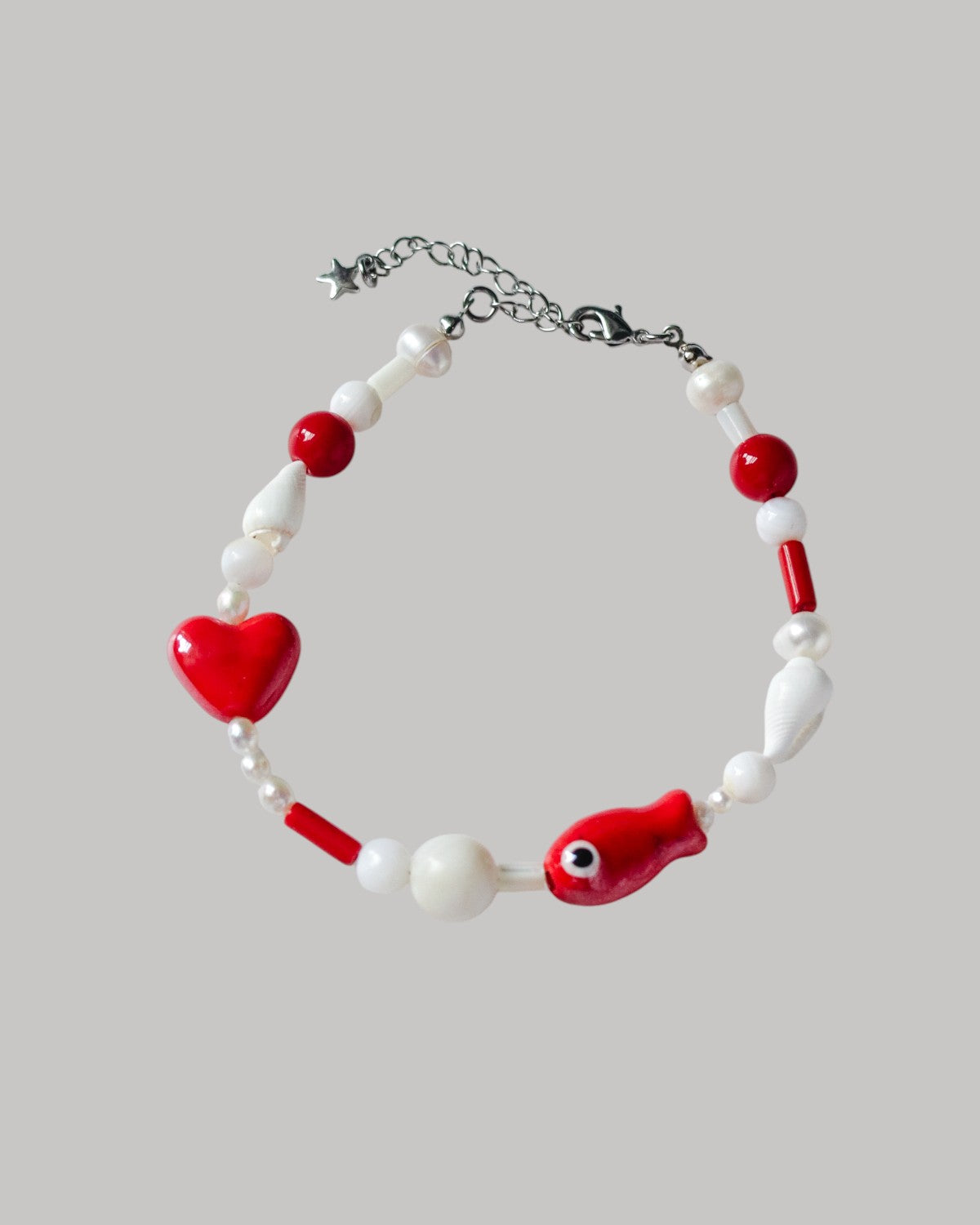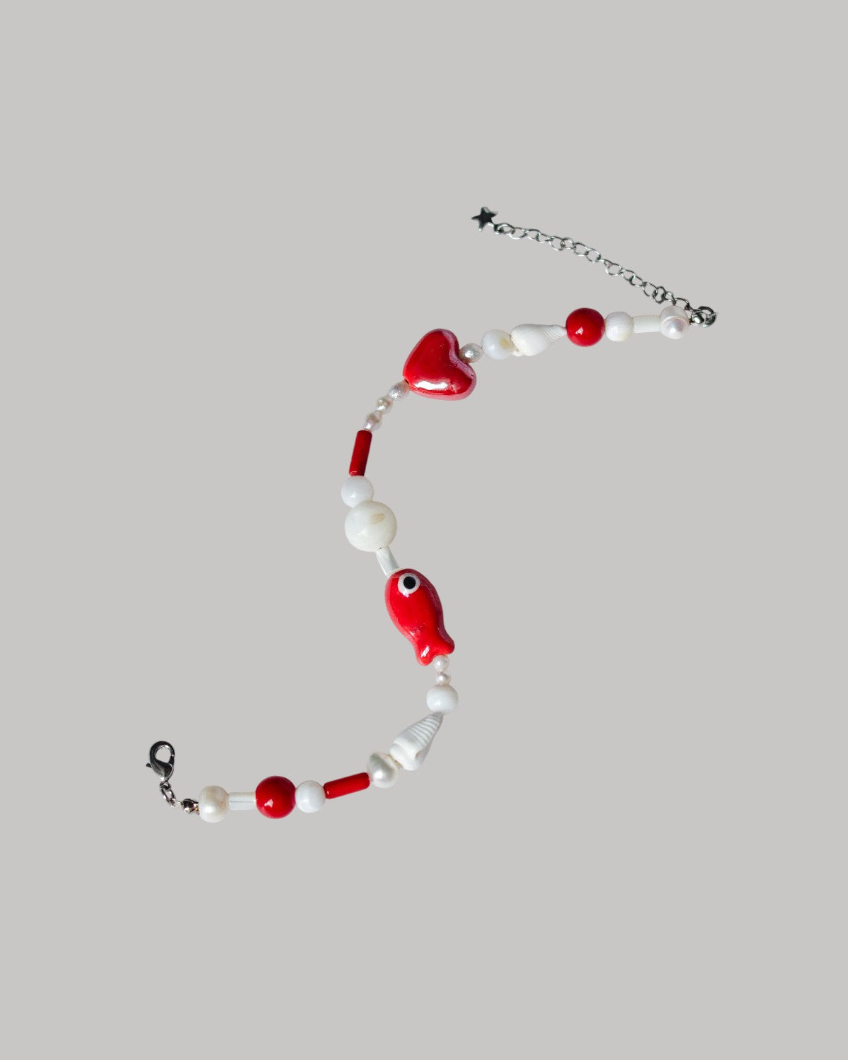 A a bracelet in white and red tones, strung with a mix of pearls, mother-of-pearl, coral, ceramic, and natural shells in varied shapes and sizes. A lively blend of textures, carrying the warmth of the shore.