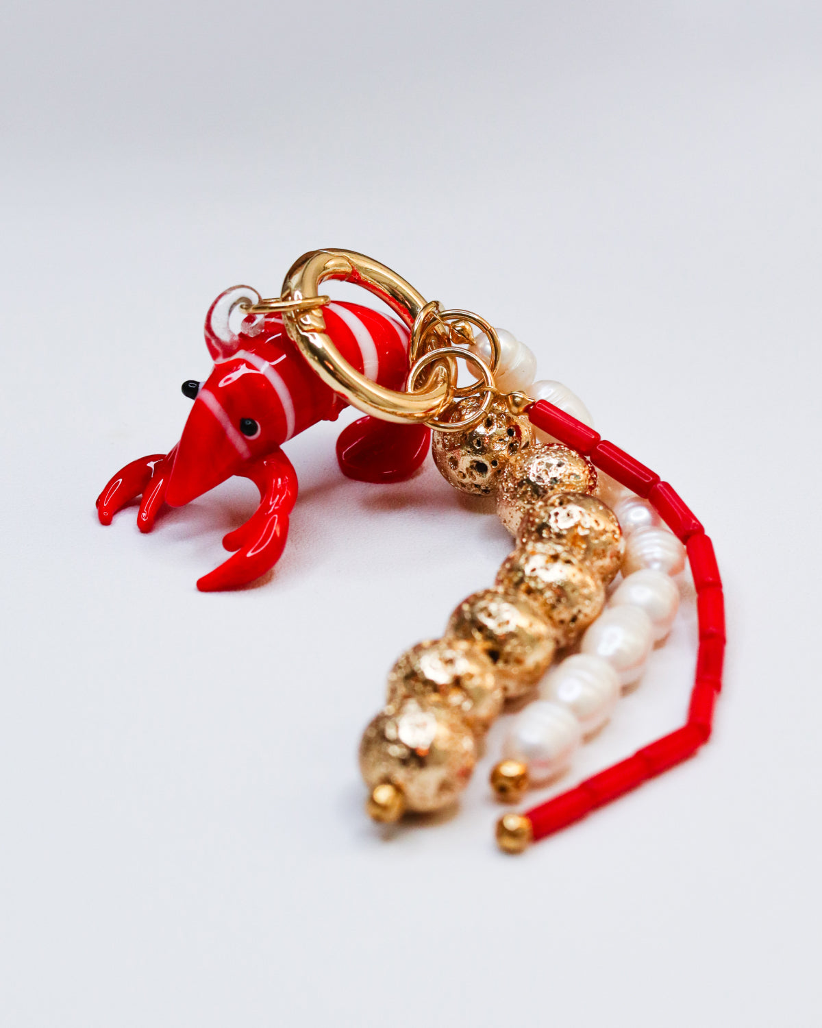 A bag charm strung with glass shrimp pendant and flowing strands of pearls, coral, and bold gold-plated lava stone beads. Playful, tactile, and a little offbeat – a tiny tide of character for your bag.
