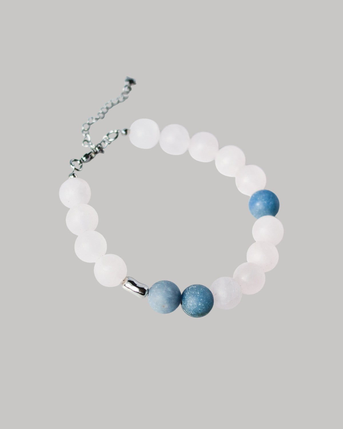 A bracelet of matte rose quartz and matte blue aventurine beads, accented with a single platinum-plated bead. Gentle in colour, balanced in texture, and quietly elegant.