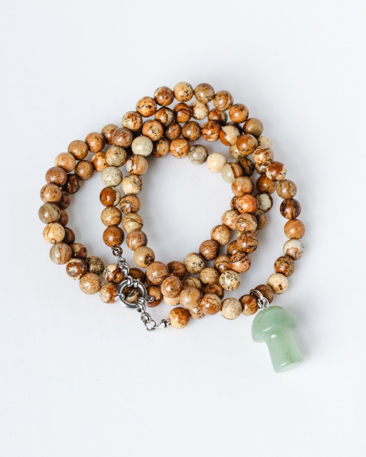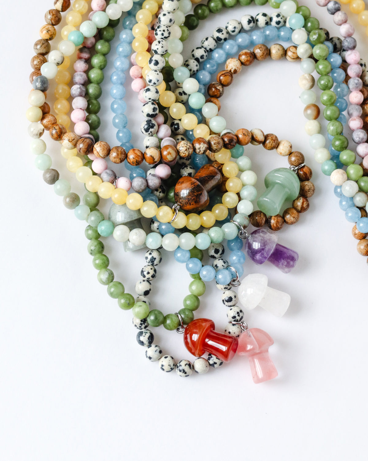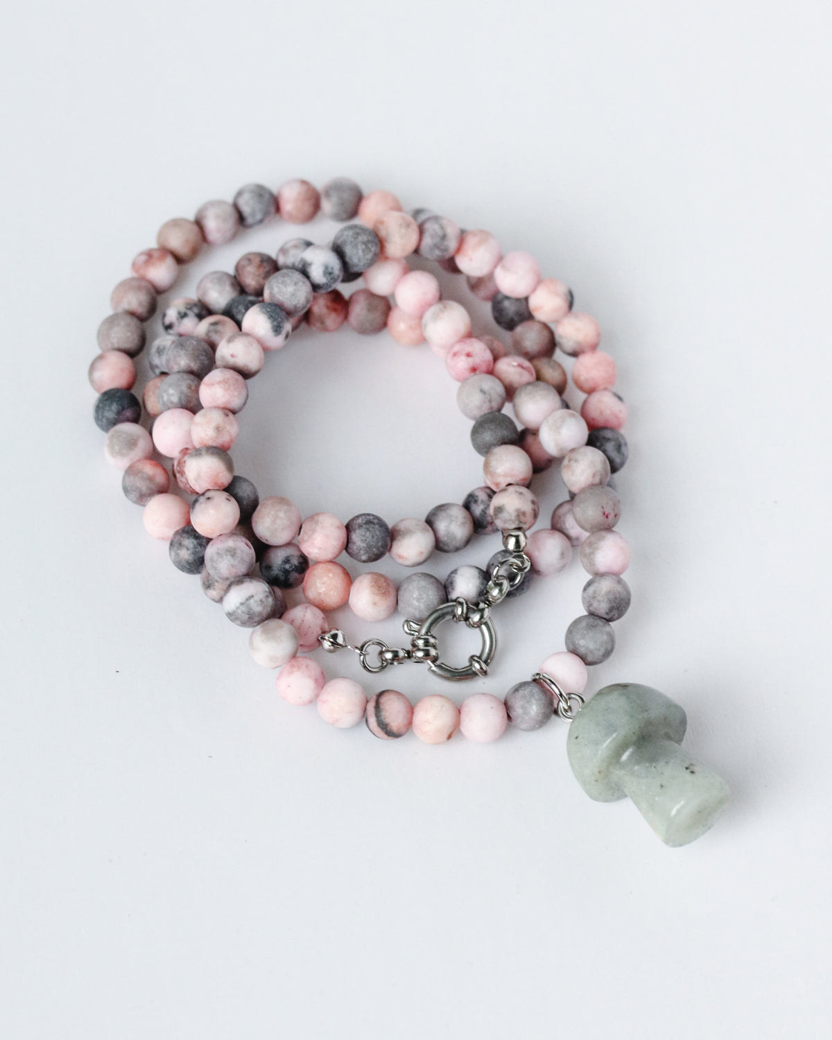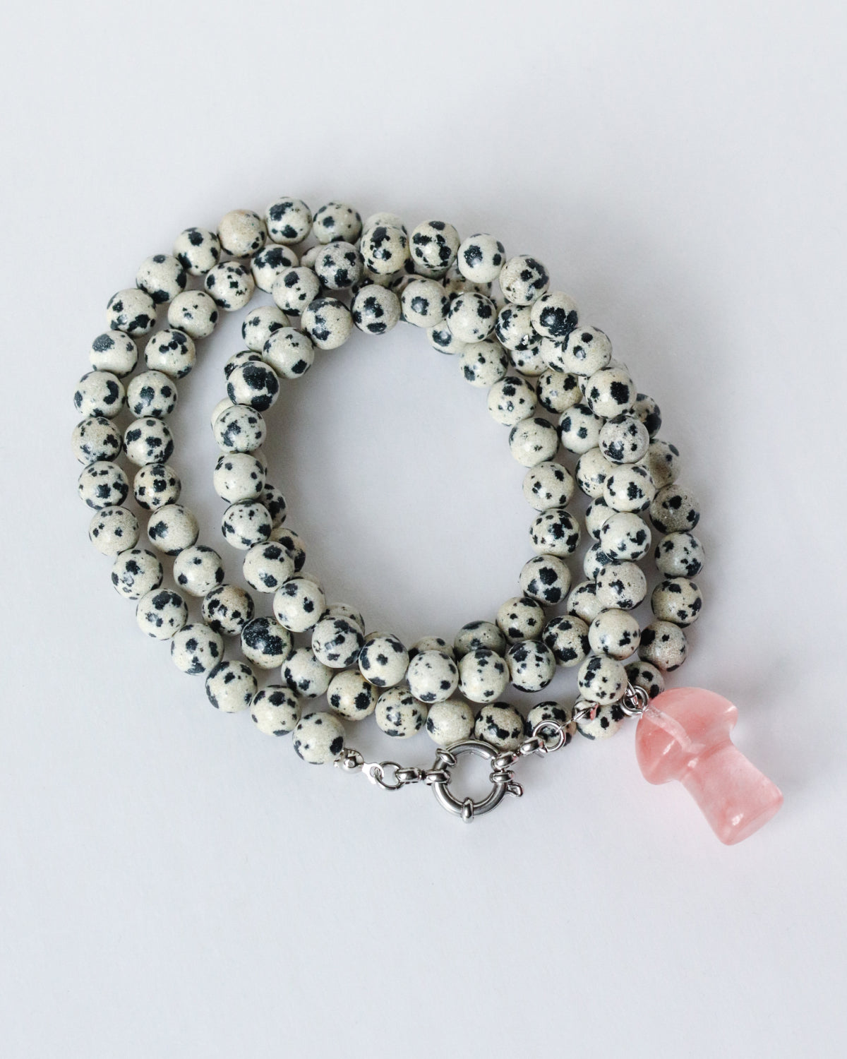 Dalmatian Jasper beads + Rose Quartz mushroom