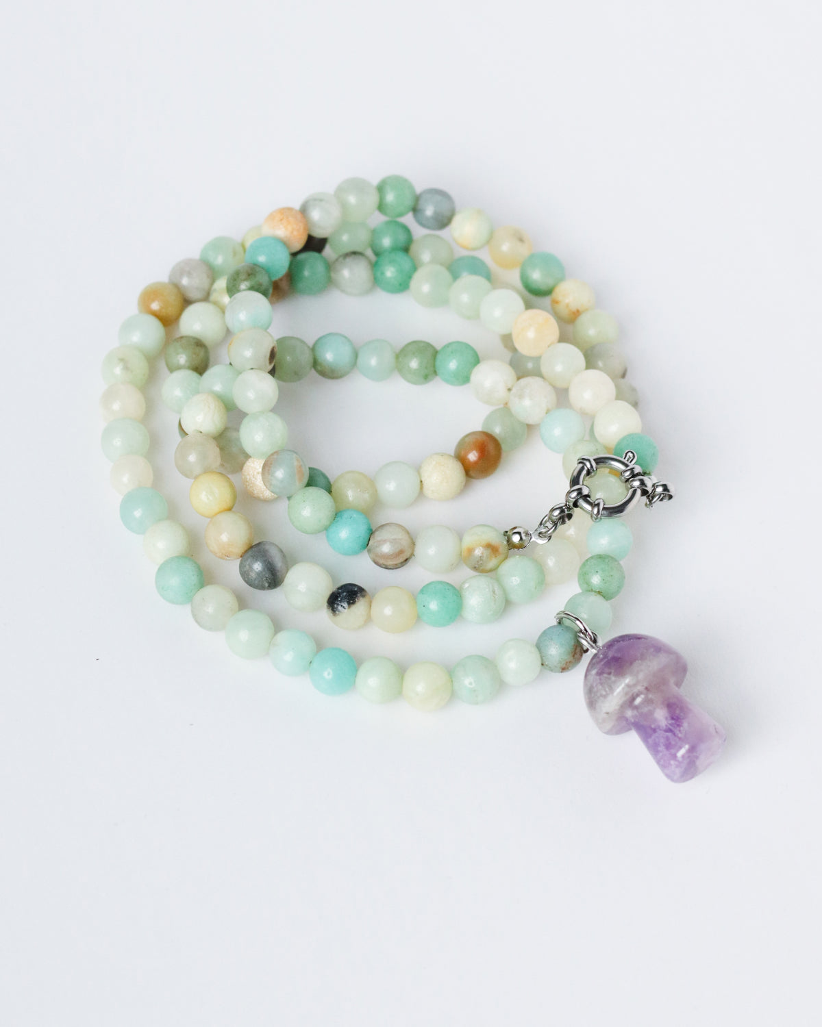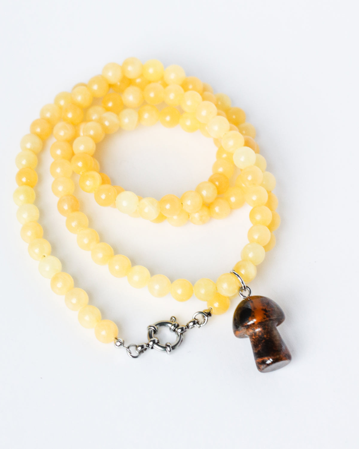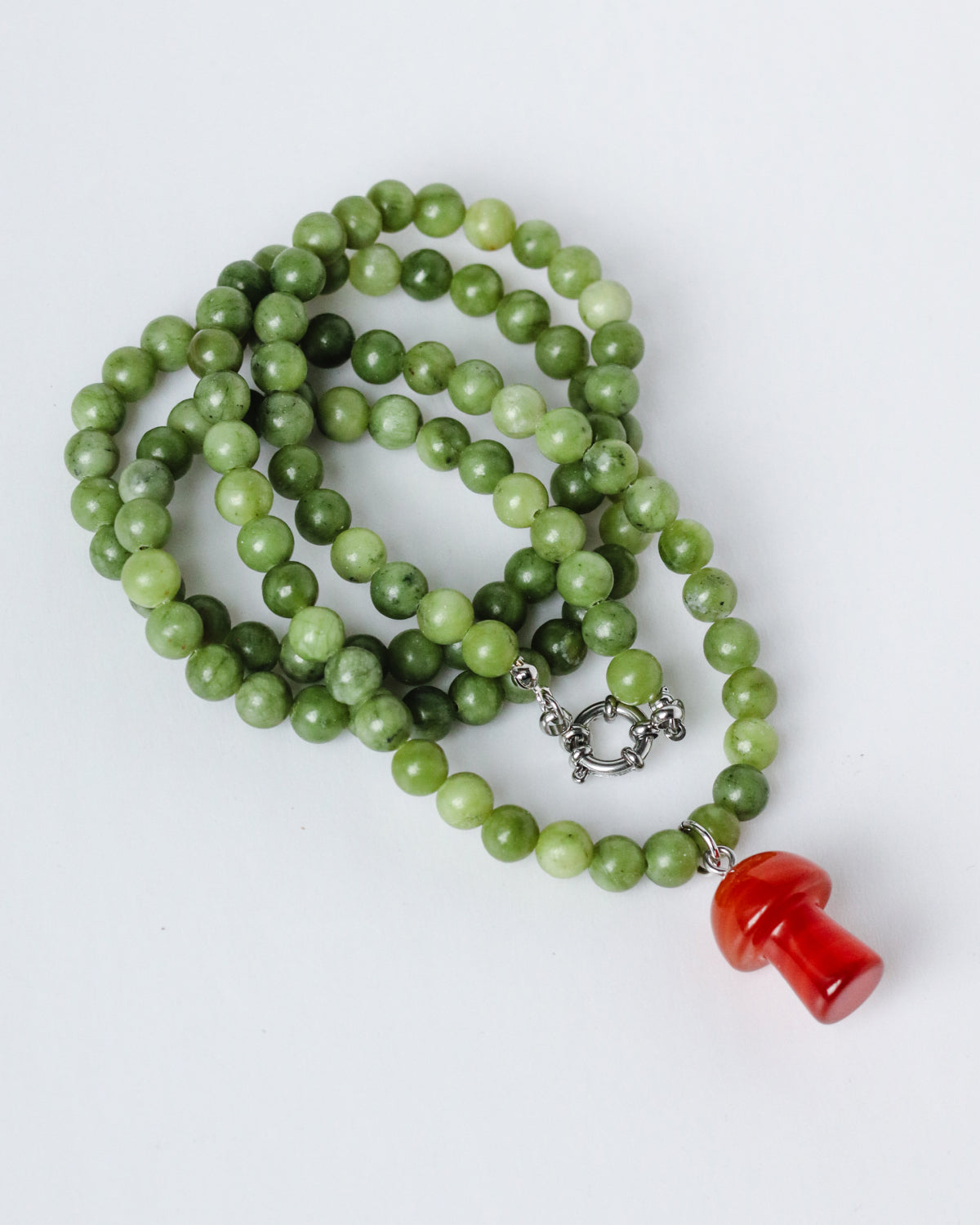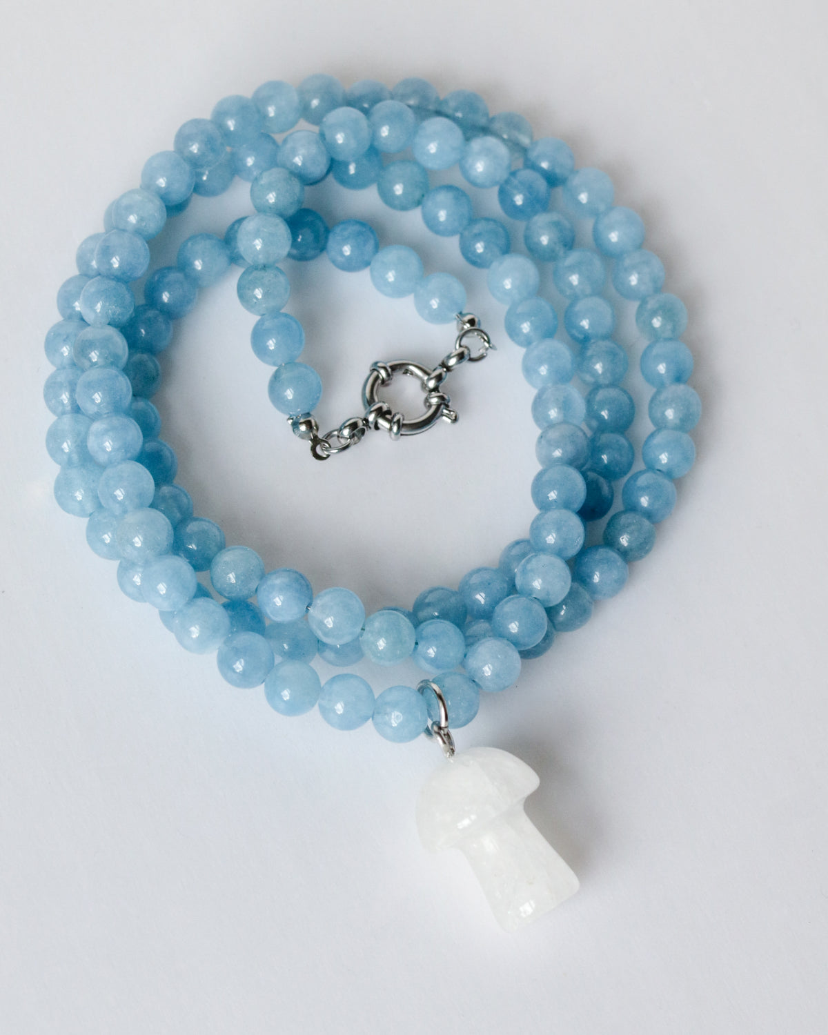 A long beaded necklace (70 cm) crafted from natural gemstones, each finished with a matching 2 cm mushroom-shaped pendant carved from stone. Every combination is unique — a quiet dialogue between colour, texture and form. Closed with a miniature round clasp.