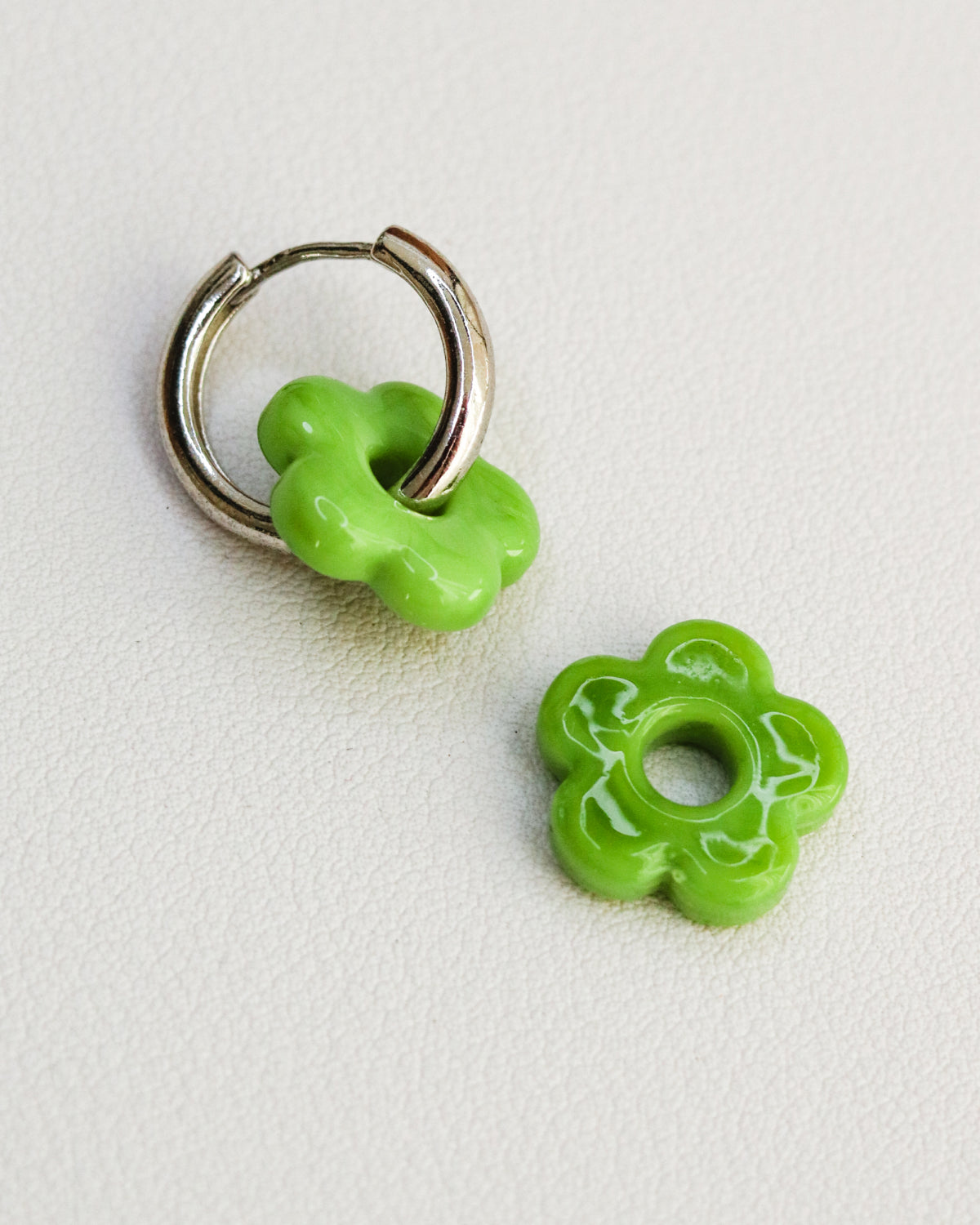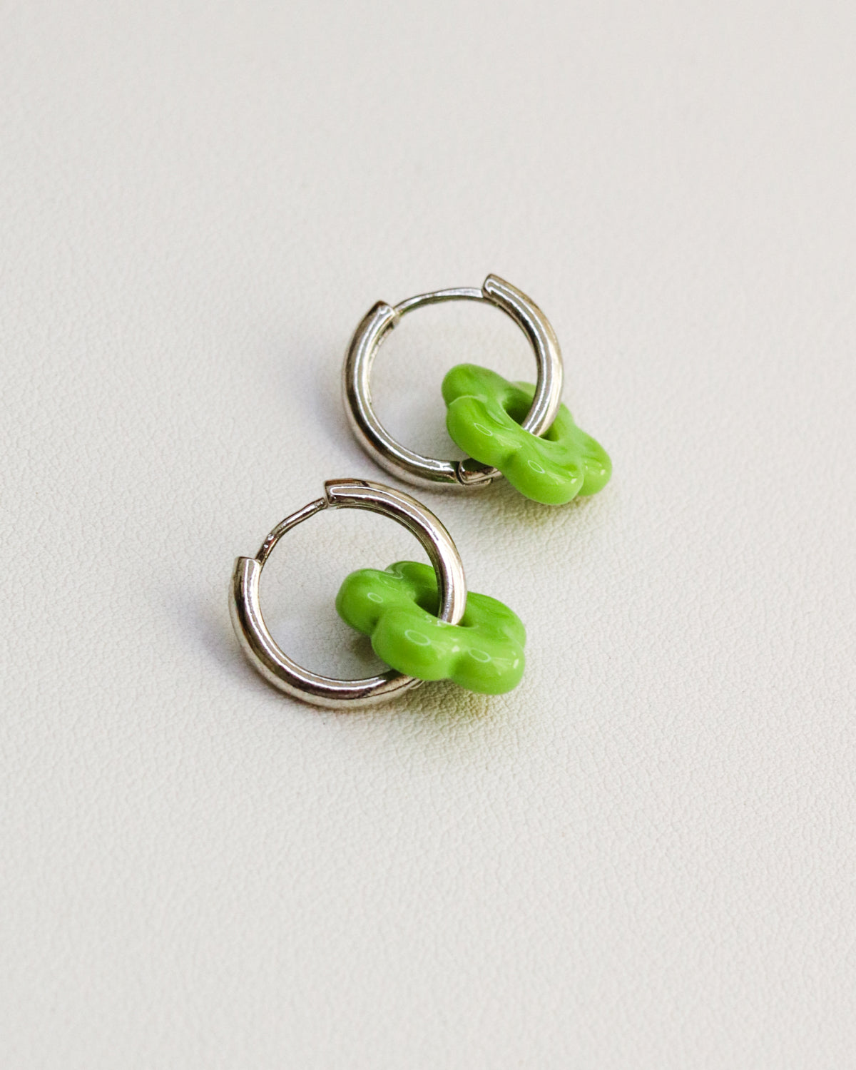 18 mm hoop earrings with removable charms shaped like glass flowers in a bright green-lime hue, the signature Wisp touch of playfulness. Light, fresh, and easy to wear – a small bloom of colour for any day.