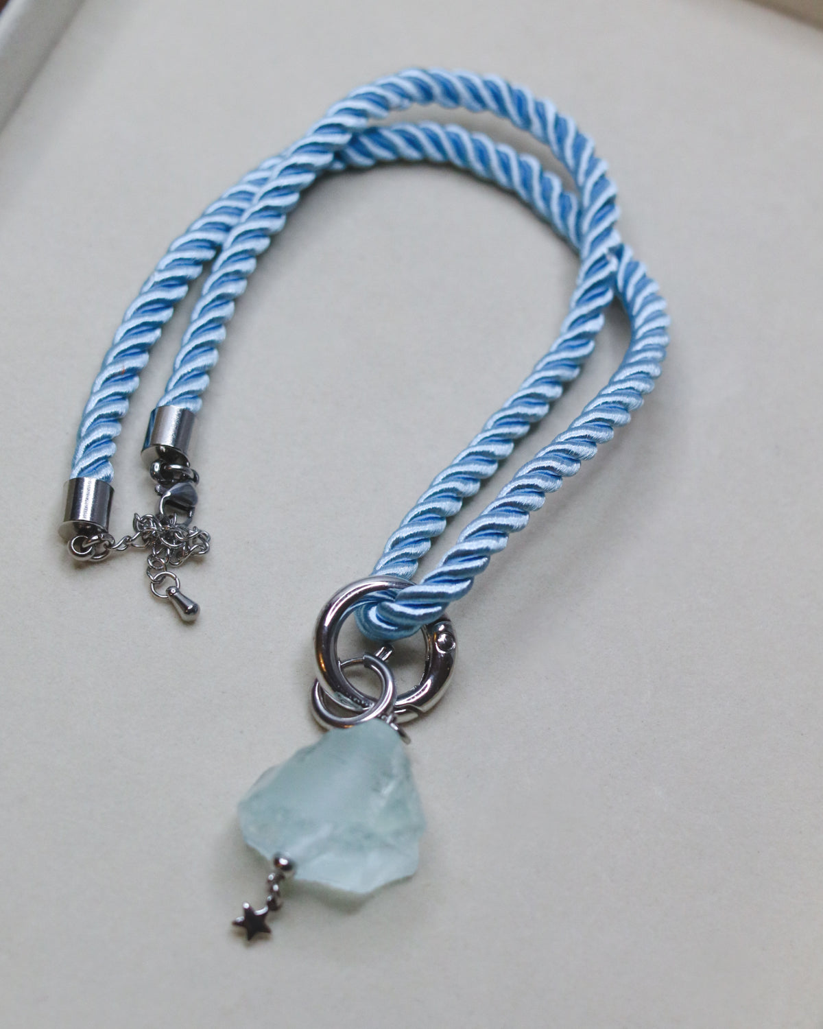 A raw blue quartz charm, around 2cm in size, shaped like a small shard of ice. Finished with a silver star and a clasp for attaching to necklaces or chains. Cool, sculptural and quietly dramatic — a tiny iceberg fragment, touched by the memory of 1912.