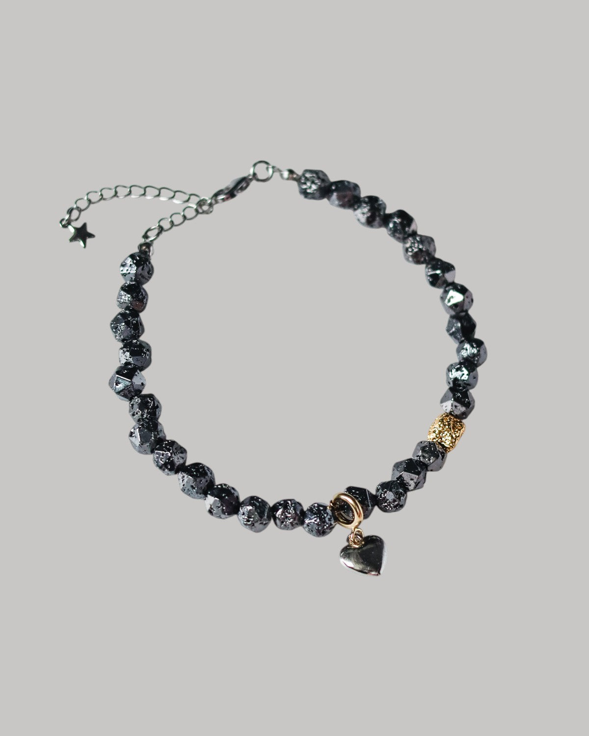 A bracelet of irregularly cut black lava stone beads, accented with a crumpled gold-plated bead and a removable platinum-toned heart charm on a clasp. Raw, tactile, and gently luminous.