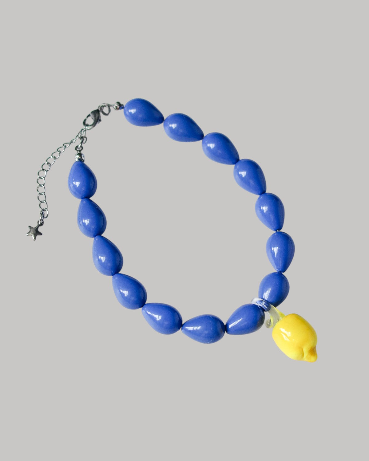A bracelet of blue teardrop beads, finished with a playful glass lemon charm. Bright, fresh, and made for sunlit days.