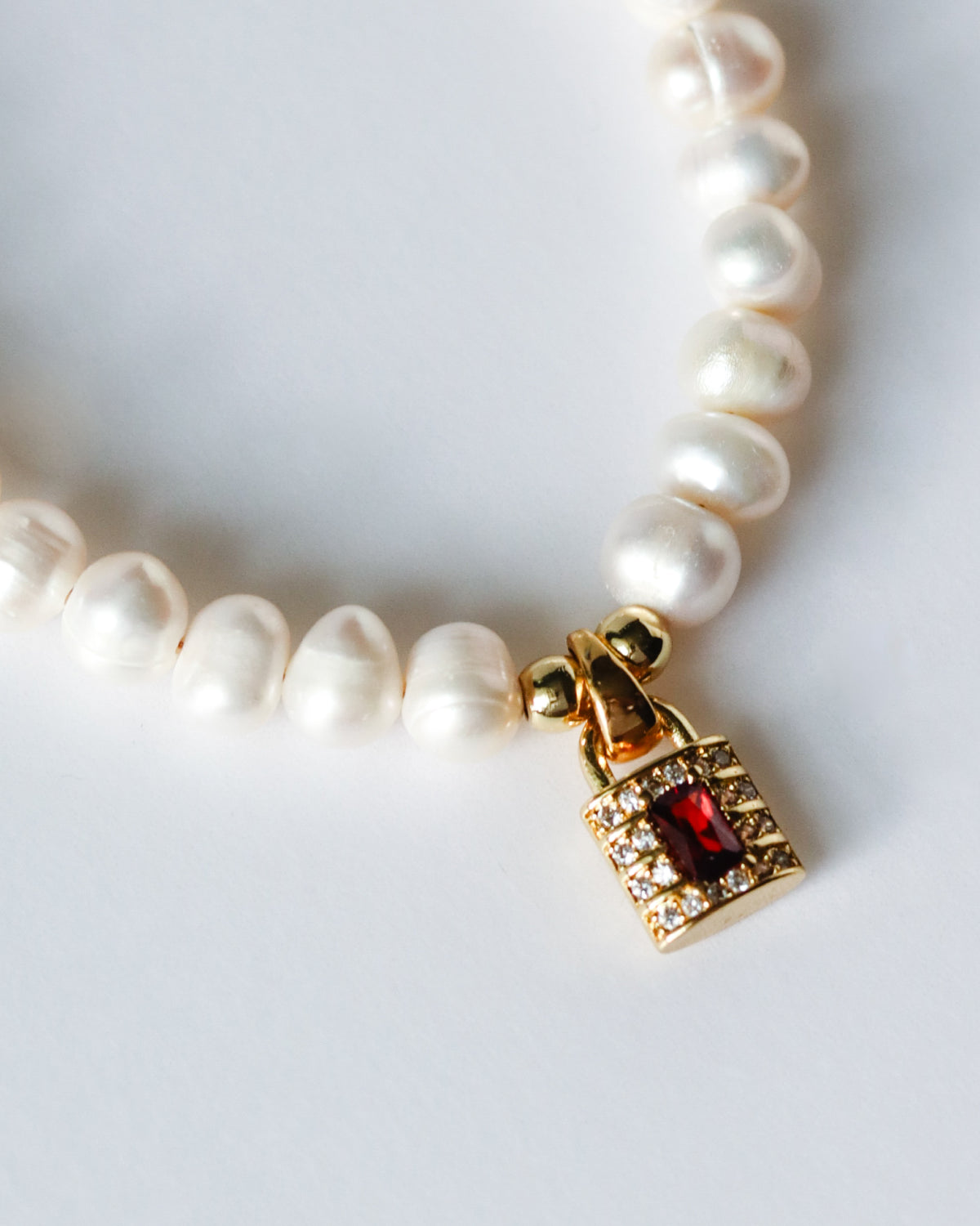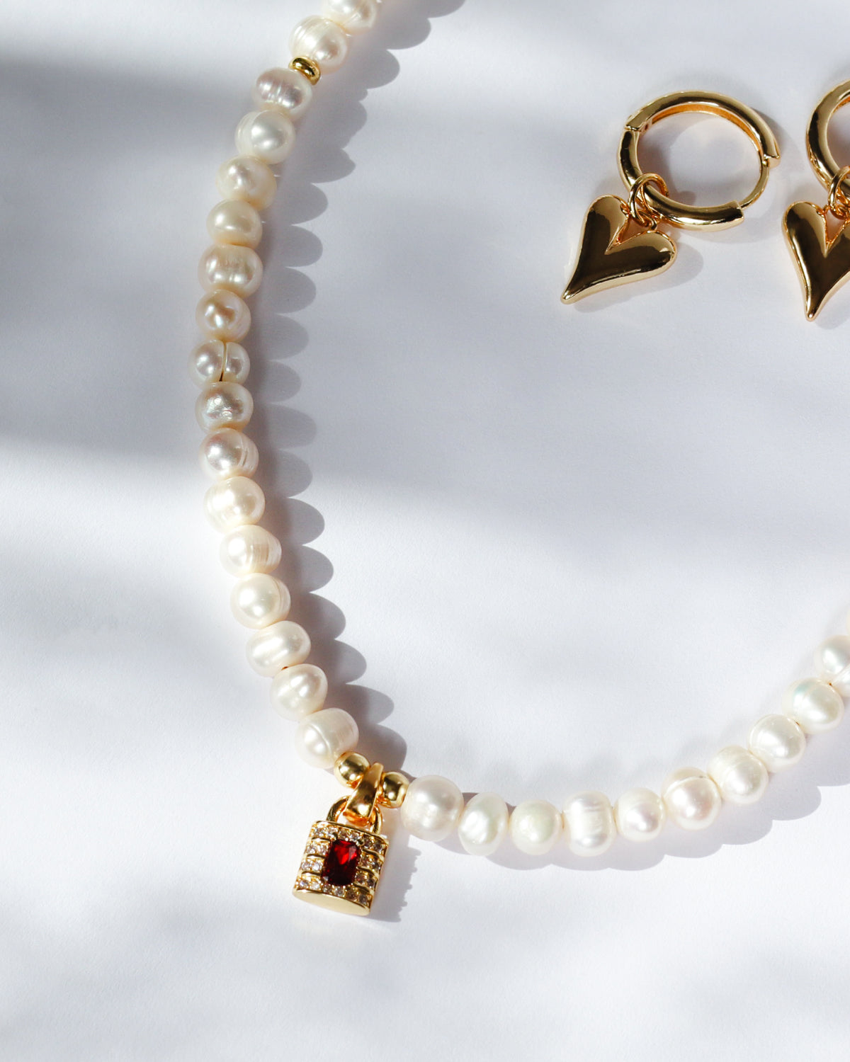 A soft string of pearls, anchored by a gold-plated heart and a single red zircon glowing at its centre. A quiet flame, a tender spark – made to sit close and shine gently.