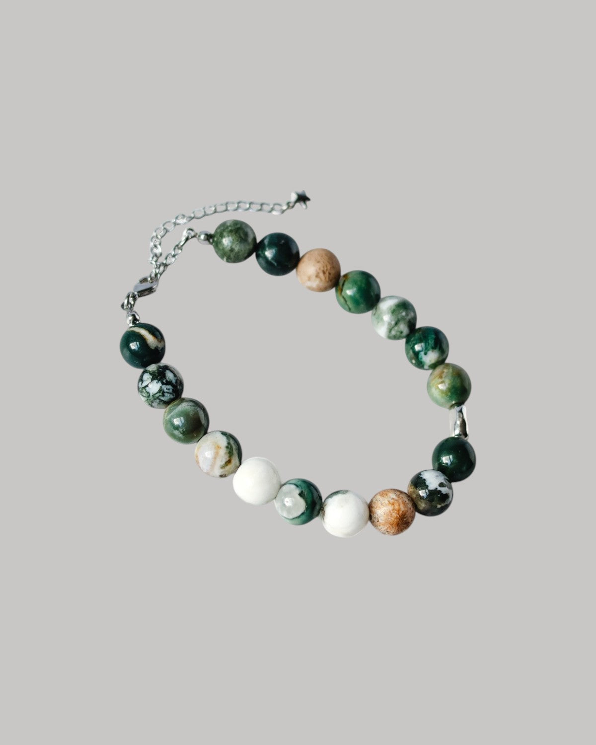 A bracelet of moss tree agate beads, accented with a single platinum-plated bead. Quietly earthy with a touch of shine.