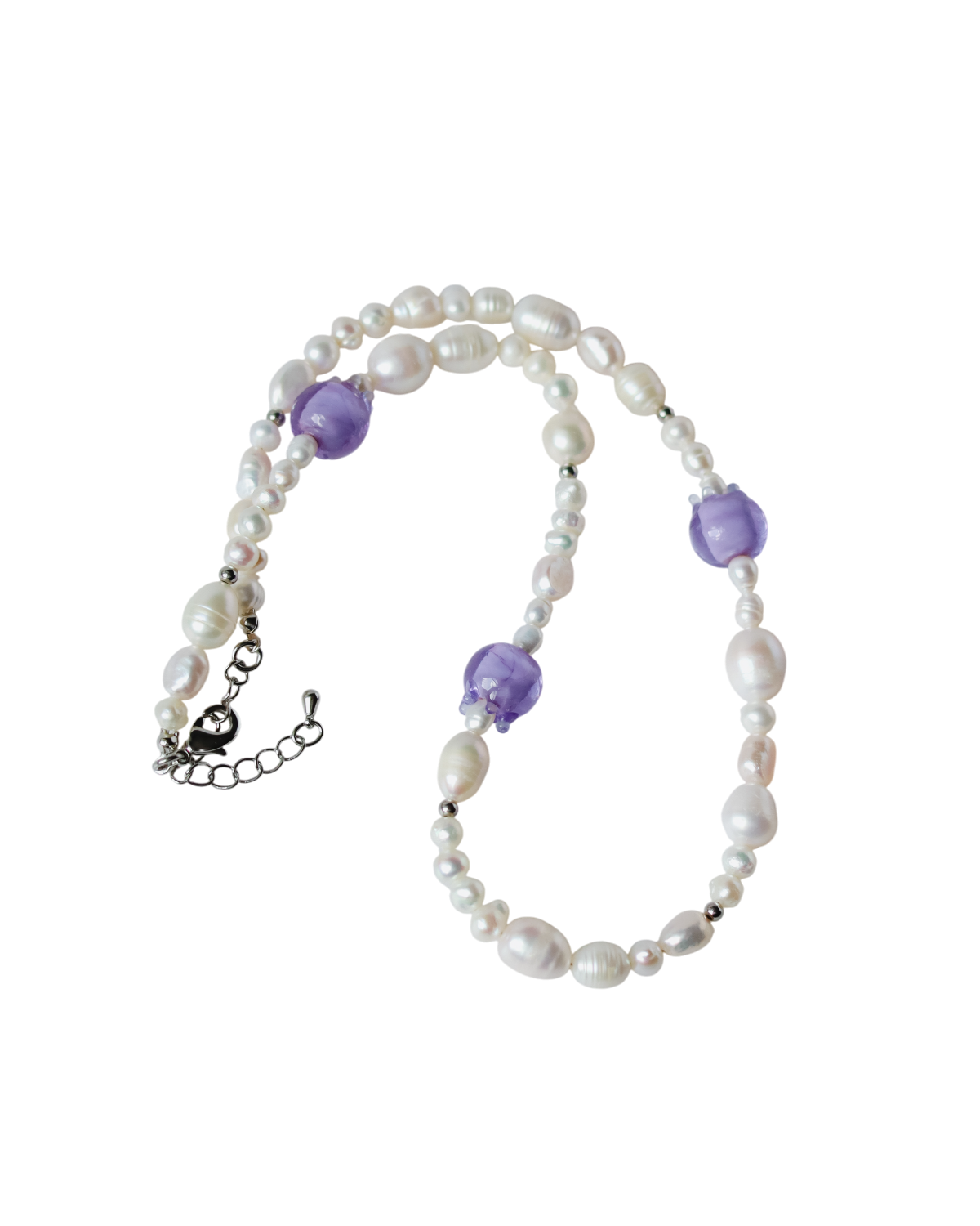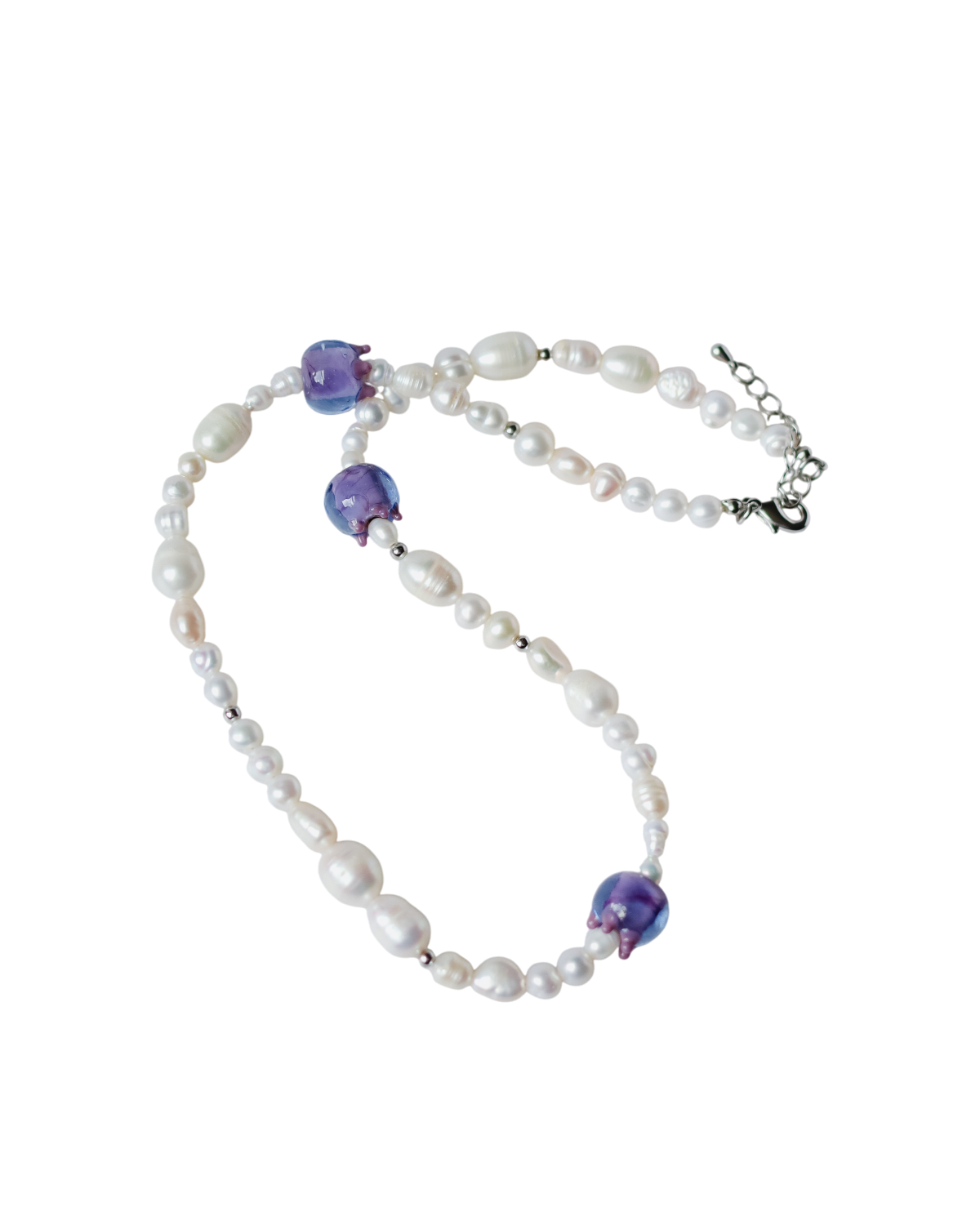 A collection of necklaces strung with pearls in varied shapes and sizes, interwoven with glass beads shaped like blueberries. Deep midnight blue, rich violet, and soft lilac tones come together in a gentle mix of glow and colour – a quiet tribute to twilight berries and luminous pearls.