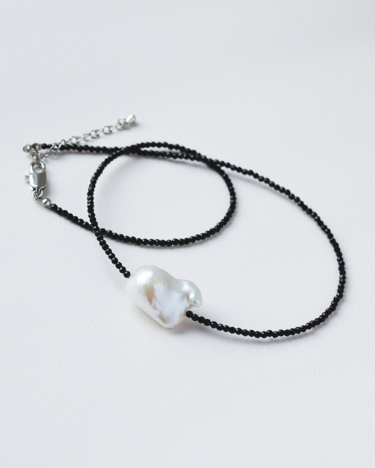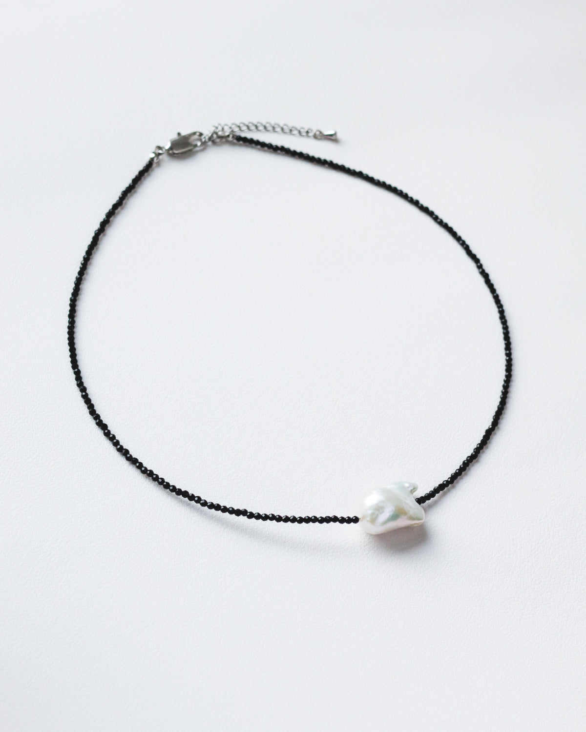 A delicate choker made from jewellery-grade black glass, finished with a natural baroque freshwater pearl at the centre. Minimal and refined, it’s designed to elevate any look — from everyday wear to special occasions.