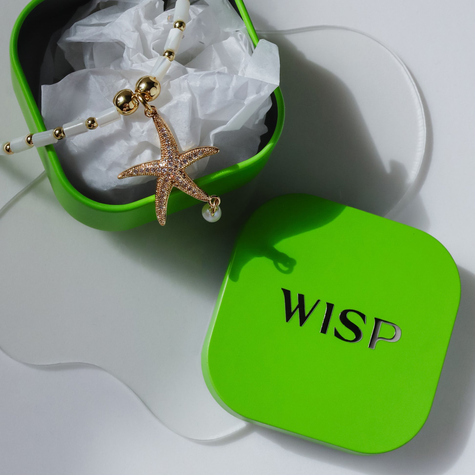 A mother-of-pearl necklace featuring a delicate starfish pendant encrusted with sparkling cubic zirconia, paired with a tiny drop of freshwater pearl. Soft, elegant, and perfect for seaside daydreams.