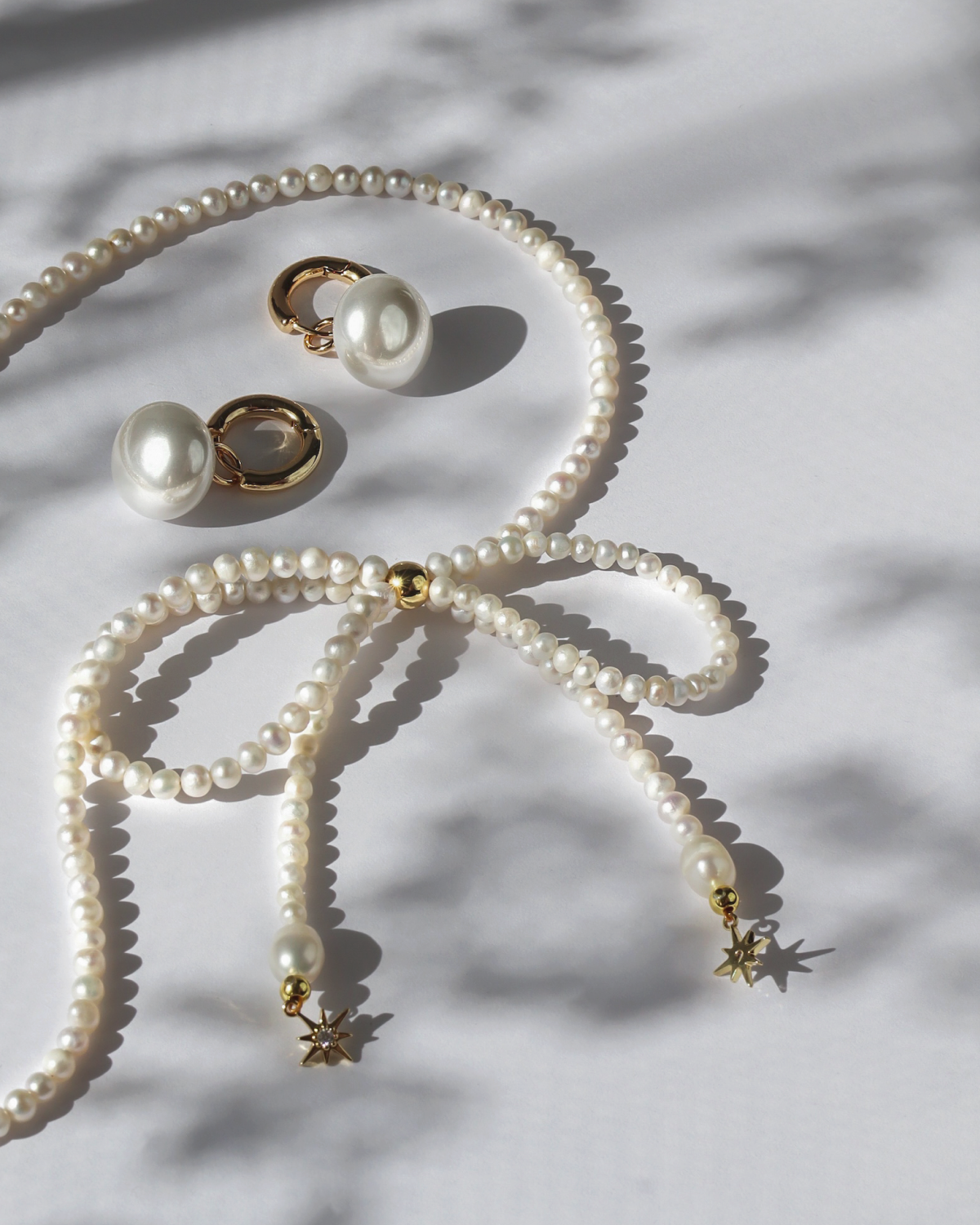 A delicate choker made from natural freshwater pearls, tied into a loose, flowing bow. Gently off-centre, softly unpolished – an intentional imperfection that holds a quiet kind of charm. A piece that feels effortless, like something found rather than made.