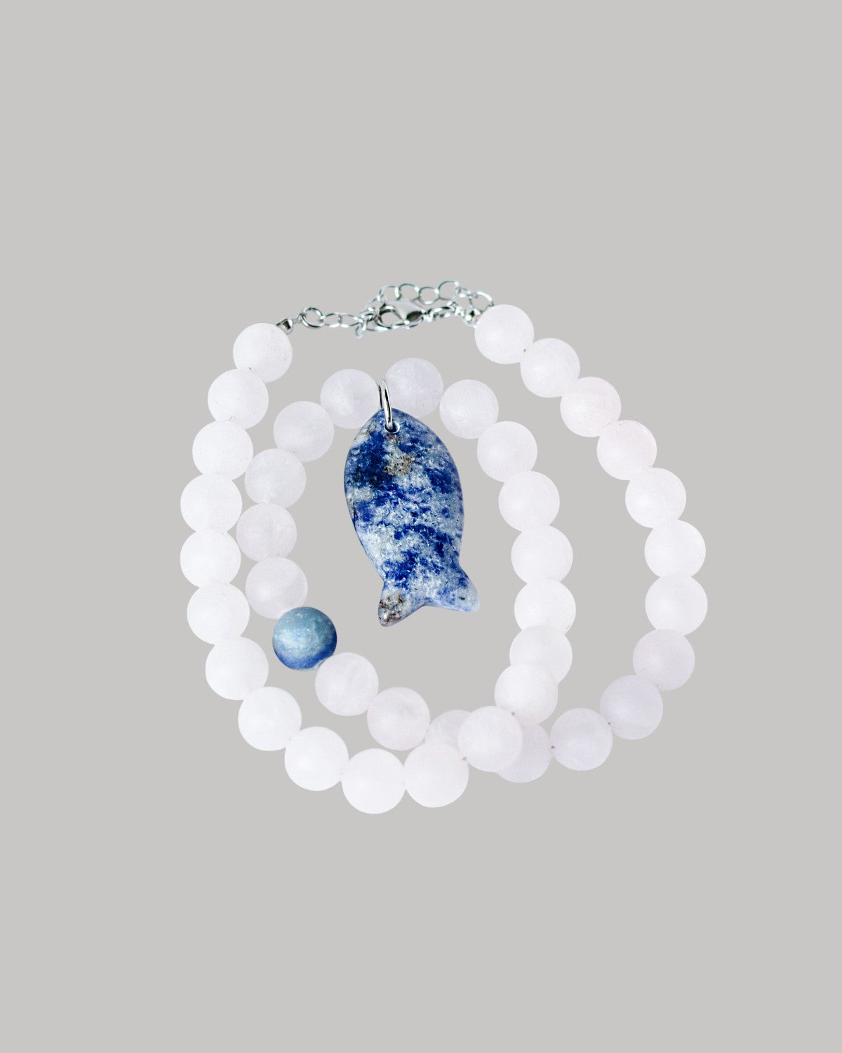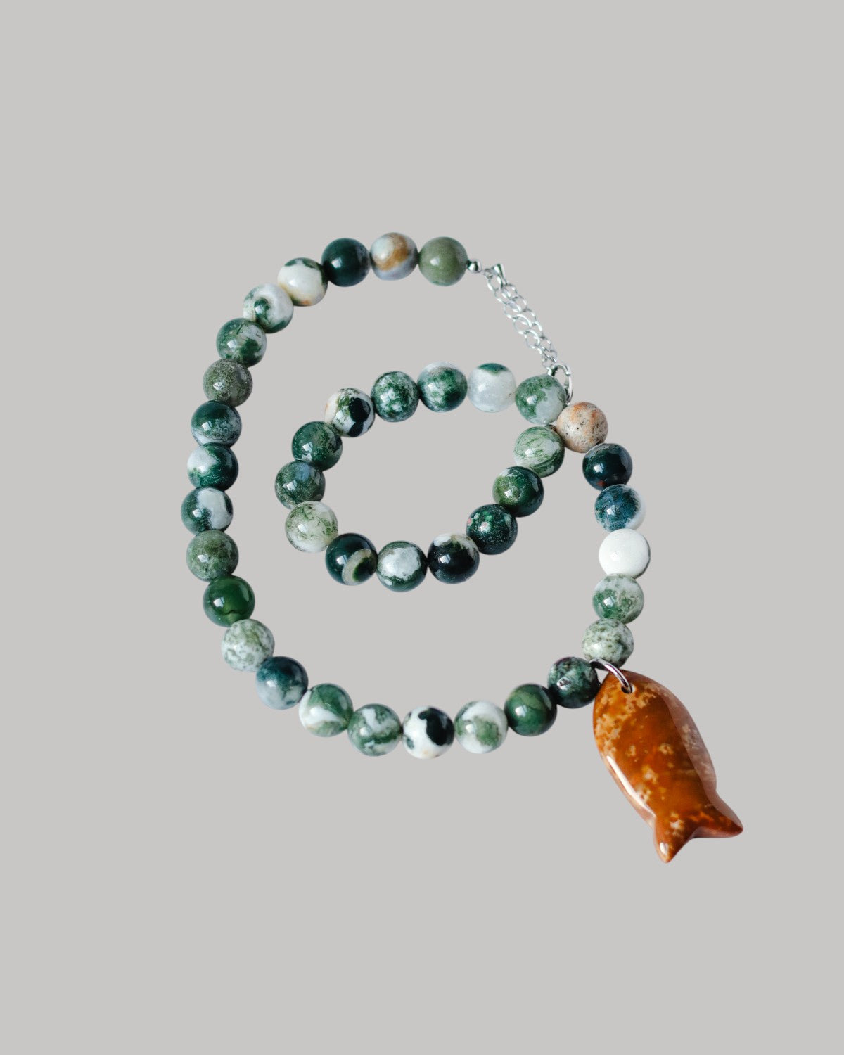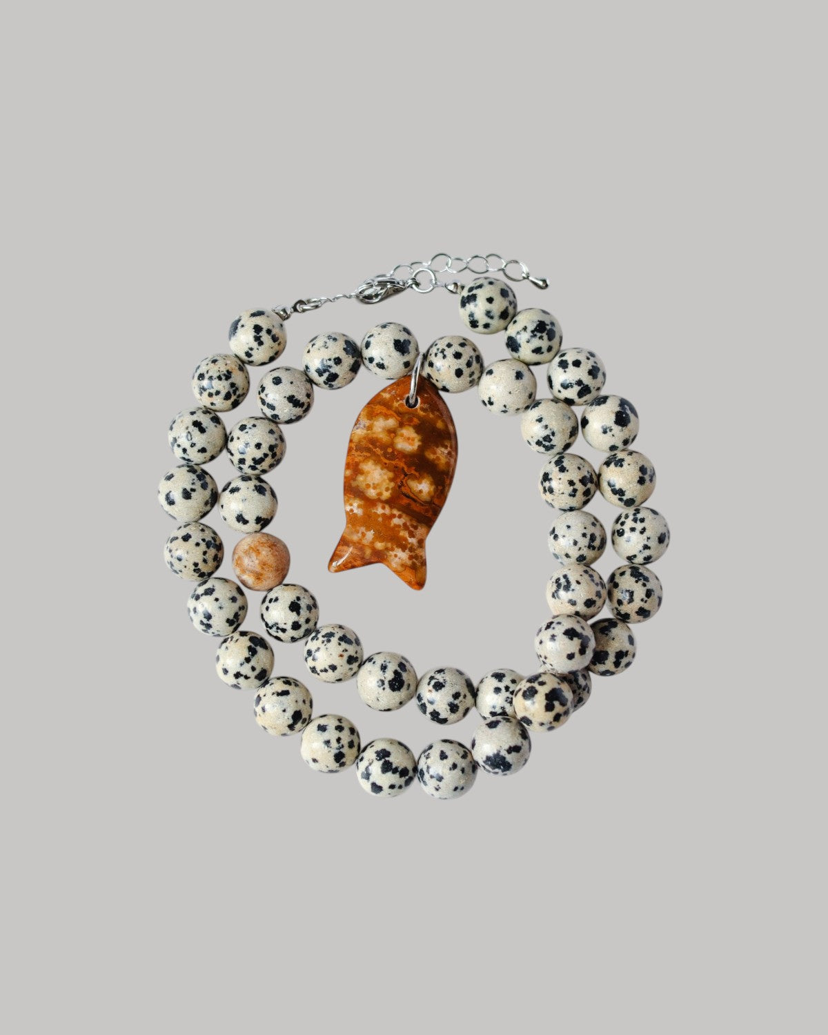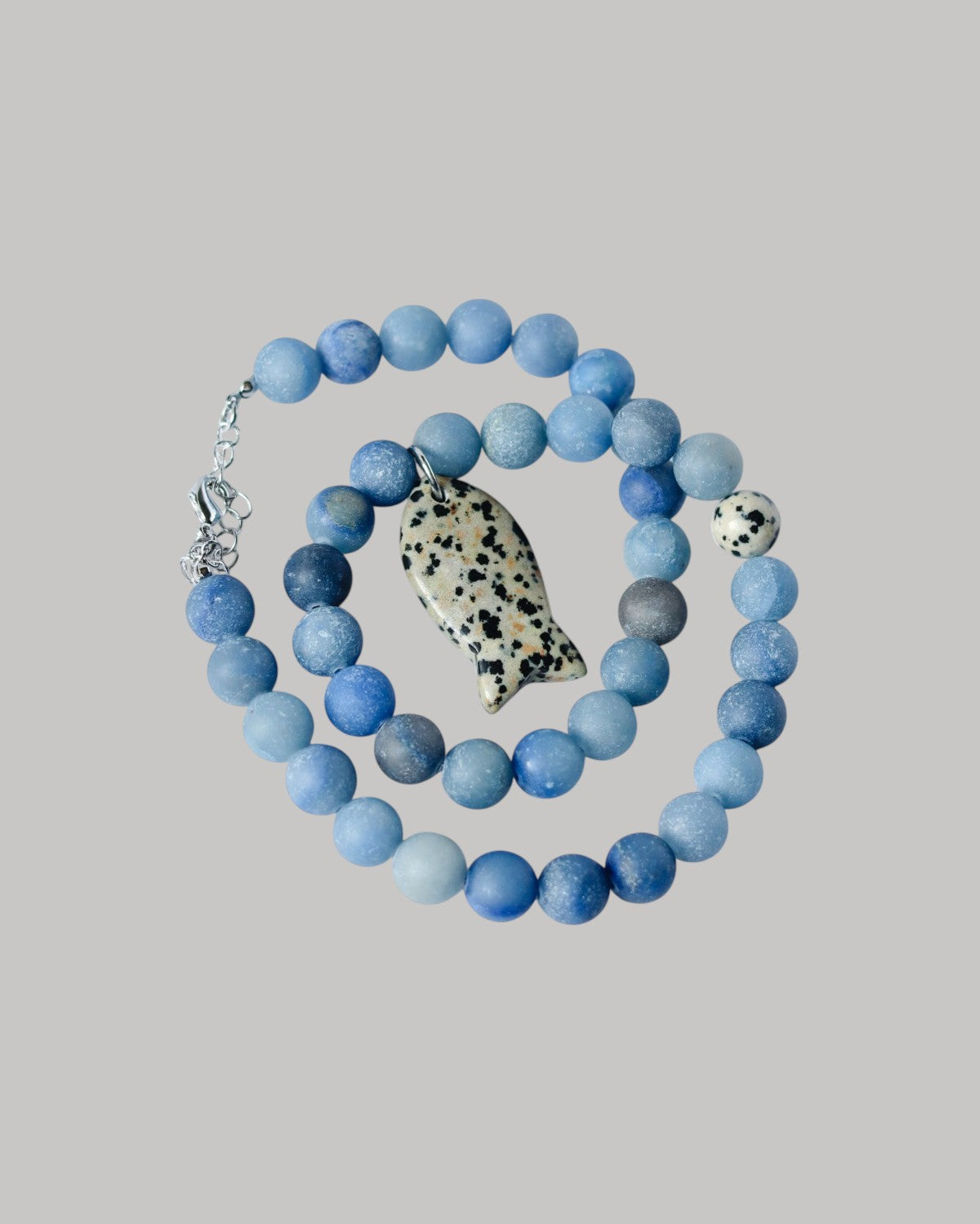 A minimalist necklace strung with natural stone beads, each finished with a carved fish pendant. Four variations to choose from: speckled dalmatian jasper with a brown crazy agate fish; matte blue aventurine with a spotted dalmatian jasper fish; soft matte rose quartz with a blue point jasper fish; and moss tree agate with a brown crazy agate fish. Sculptural, understated, and quietly playful – each necklace carries its own unique character.